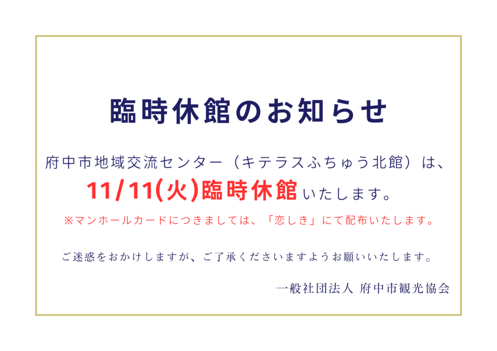 キテラス臨時休館11/11 府中市地域交流センター(キテラスふちゅう北館)は、11月11日(火)は、臨時休館いたします。 当日は、【マンホールカード】を恋しきで配布いたします。 ご来館予定のみなさまにはご迷惑をおかけしますが、ご理解のほどよろしくお願いいたします。 お問合せ (一社)府中市観光協会 0847-43-7135 前ページへ戻る