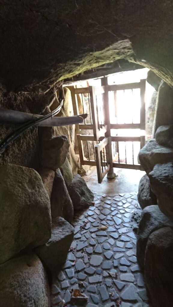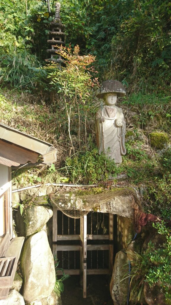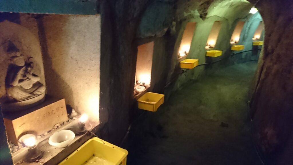 珀明洞は長さ約100mで洞内に33体の観音像が安置され、中央の広場に摩尼殿があります。摩尼殿は亡者のために水供養をする場で、池の畔に立っている石の地蔵尊に経をとなえながら水をかけるのです。当寺の21世鎌倉勝寿住職が、一念発起、昭和29年からほとんど独力で岩を堀り、16年の歳月を経て昭和45年に完成したものです。