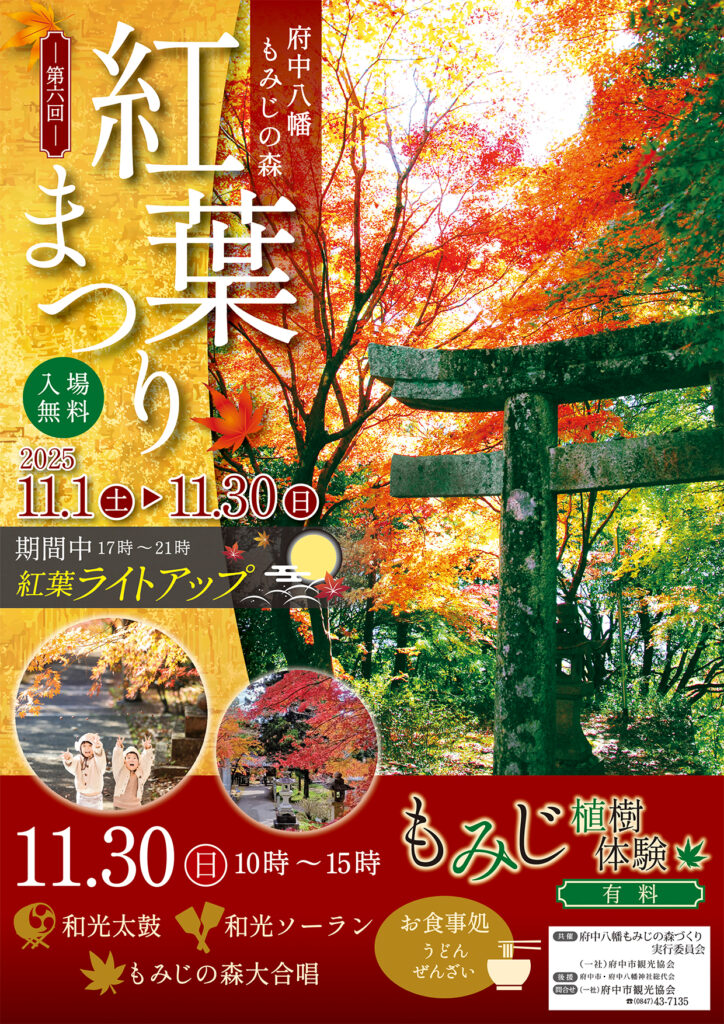 観光イベント| 11月 府中八幡紅葉まつり 令和7年11月30日(日) 10:00~15:00 催し物・お茶席・お食事処など 八幡神社には、ものづくりの町、府中市にふさわしく木工、金属加工などの神様をお祀りする祠があります。秋には鳥居下から随身門をくぐり、本殿に向かう参道や境内周辺が燃えるような紅葉の色で美しく色づきます。 詳しくは、こちら 【Information】 場所 府中八幡神社 例年開催日 11月下旬 事務局 (一社) 府中市観光協会 お問合せ先 電話:0847-43-7135 【Access】 前ページへ戻る 関連リンク 府中八幡神社 府中八幡神社は、八尾城の守護神であったと伝えられま… もっと見る >